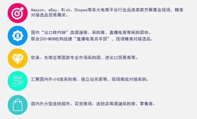 30+Amazon、eBay、Shopee、Lazada、Joom、Yondex、速卖通、天猫、京东等主流电商平台现场对接。近20000名大中型电商卖家强势关注,展会现场看样交易,展后工厂进行实地考察,有效提高展会的实效。