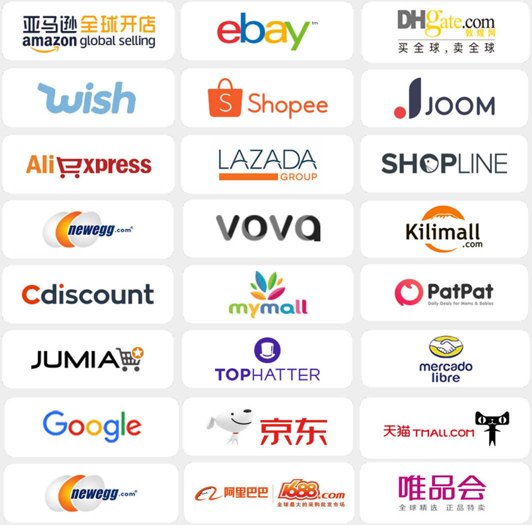 Amazon、eBay、Wish、Shopee、Yandex、Lazada、Joom、Vova、Newegg、Paytm、Tophatter、Flipkart印度、Jumia、速卖通、兰亭集势、淘宝网、京东、唯品会等。