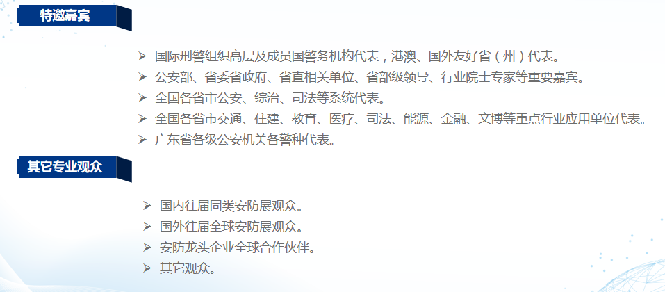 国际刑警组织高层及成员国警务机构代表,港澳、国外友好省(州)警务机构代表,全国公安机关领导及代表,广东省各级公安机关领导和各警种领导及代表,省委省政府、广州市委市政府领导及代表,全省交通、住建、教育、医疗、能源、金融、文博等各行业主管部门组织的用户单位代表,以及安防行业企业代表和买家团,组成逾10万人规模的专业观众团体,齐聚广州,共襄盛举。