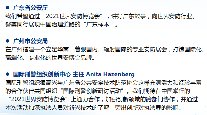 广东省公安厅、广州市公安局作为本次博览会指导单位,将全力支持博览会举办。广东省公安厅、广州市公安局在博览会设 “数字政府”及智慧新警务展区,并举办智慧新警务研讨会。全国各地公安系统、全省各警种和各地市公安局负责人、国内外安防行业知名专家、国内外安防企业领军人物将应邀出席。