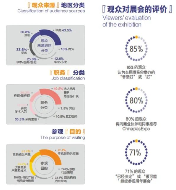 展会深入细分市场,根据展商需求精准邀约来自橡塑制品、化工及原料加工成型设备、包装/印刷、电子电器、汽车、建筑、模具、新材料食品饮料、医疗等领域的专业采购商。72%的展商对参展总体效果表示非常满意并有83%的展商计划继续参加下届展会。