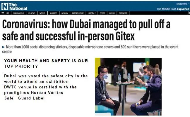 2021年2月18-20日中东阿联酋规模最大的食品展--迪拜海湾食品展Gulfood顺利开展。 其中特别需要注意的是,《The National》在2020年12月7日的报纸上刊登了关于为这次海湾信息技术展(GITEX)采取的健康和安全措施的整版特写。 用海湾信息技术展GITEX 2020向您证明最安全的面对面商业环境