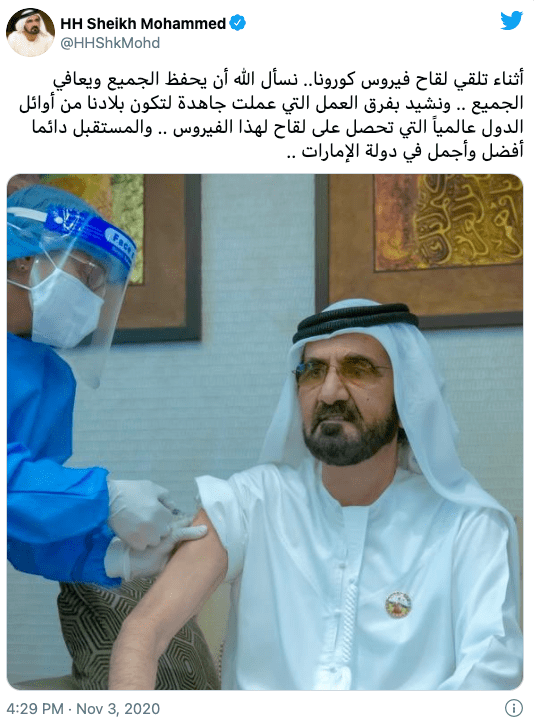 此外,阿联酋是第一批率先使用中国疫苗的国家之一的,并且2020年11月3日,由迪拜酋长穆罕默德·本·拉希德·阿勒马克图姆率领的政府官员及民众接种了中国疫苗,这标志着阿联酋迪拜对中国产品的信心,中阿双边的经贸往来会率先恢复及增长,领先于世界其他国家。