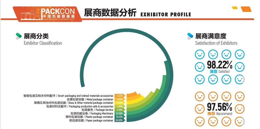 2021中国包装容器展得到了纸包装、塑料包装、金属包装、包装材料及配件、自动化包装机械设备、玻璃及其他材料包装以及包装服务领域企业的鼎力支持,包括秉信包装、大胜达、奥瑞金、顶正包装、大亚新材、欧诺机械、和昇、群乐包装、韶能集团、国豪机械等等。98.22%的展商对于本届展会给与高度评价。