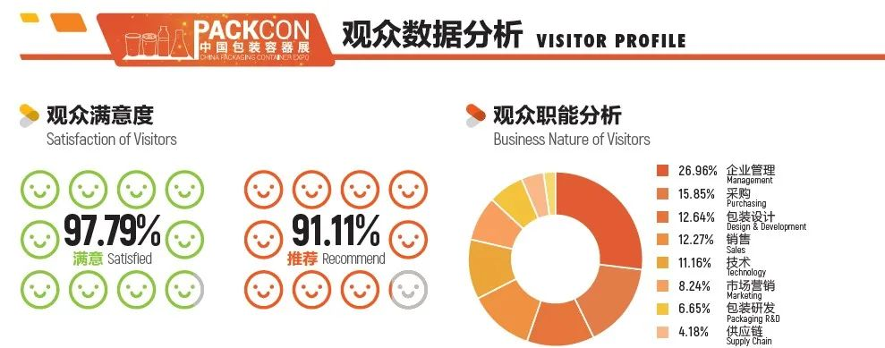 经主办方统计,本届展会观众主要来源于食品、机械制造、日用品、日化、饮料等领域,企业高管、采购、包装设计人员占比超50%。观众感兴趣的产品前三名分别为纸包装容器、塑料包装容器、包装材料及配件。令人欣慰的是,97.79%的观众对本届展会表示满意,其中91.11%的观众表示该展会值得向同行推荐。