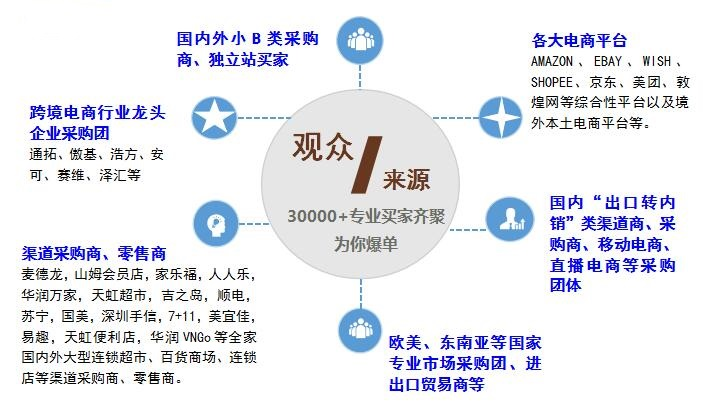 邀请30000+名各大电商卖家,涵盖多个行业龙头企业采购团,实现真正优质资源对接,解决电商优质货源选品难题。诸多线下大型、连锁卖家也将进行现场选品,与电商大卖家/厂商等进行有效互动。